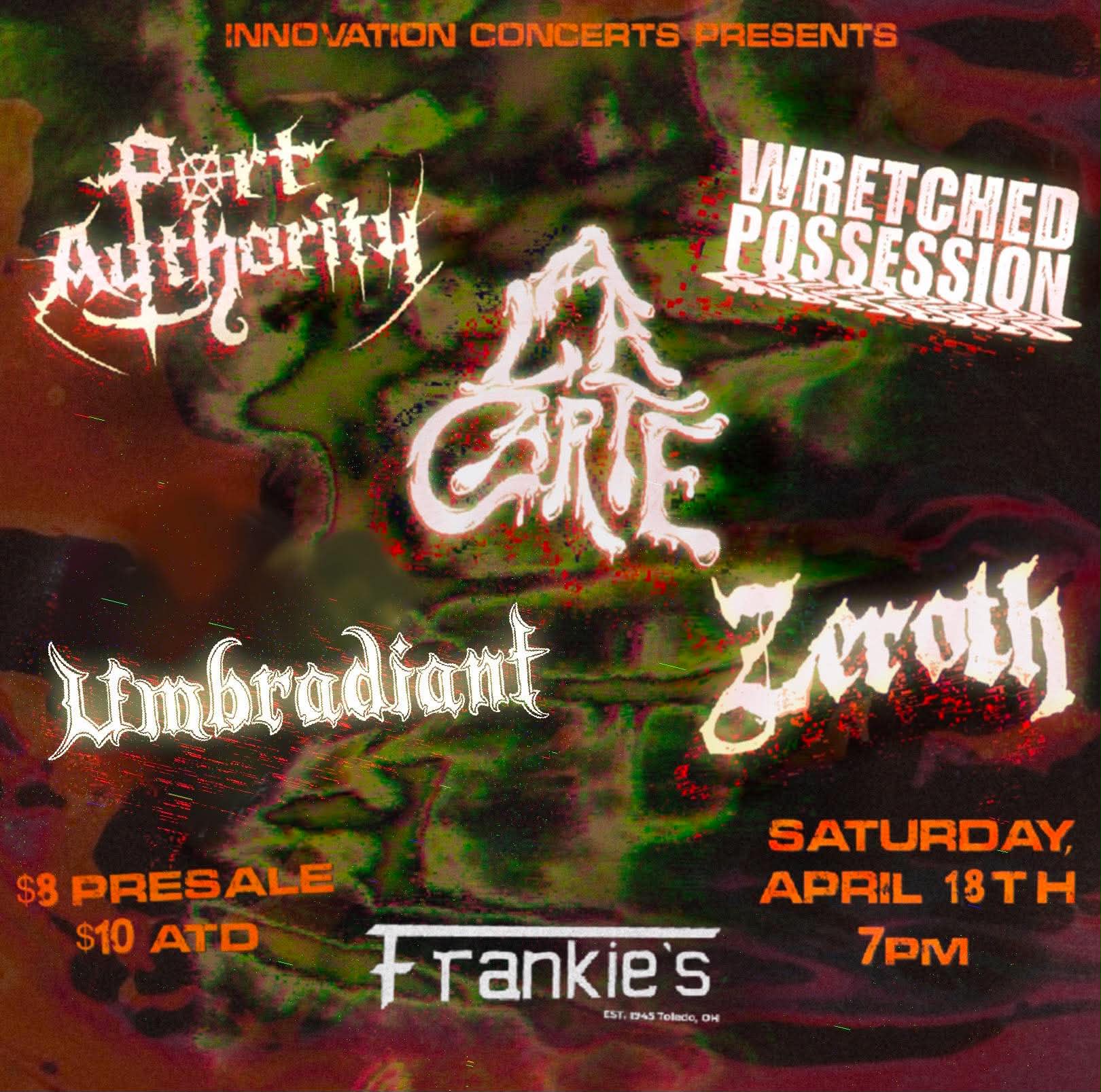 wsg/ Zeroth, A La Carte, Wretched Possession, & Umbradiant Advance tickets: $8.00 | $10.00 day of show +$5.00 if under 21